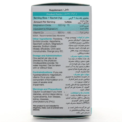 - حاوی ۳۰۰ میلیگرم منیزیم و ۶۰۰ واحد ویتامین D₃