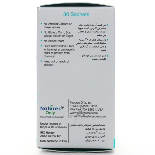 - فاقد گلوتن، شکر، سویا، ذرت، گندم، نشاسته، رنگ مصنوعی و مخمر
