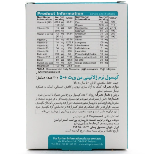 کپسول من ویت بالای 50 سال، یک مکمل اختصاصی برای تأمین نیازهای تغذیهای افراد بالای ۵۰ سال است. این قرص سافت ژل حاوی ویتامینها، مواد معدنی و عصارههای گیاهی استاندارد مانند جینسینگ و جینکوبیلوبا میباشد که به آزادسازی انرژی، کاهش خستگی و پشتیبانی از عملکرد طبیعی سیستم ایمنی کمک میکنند.
