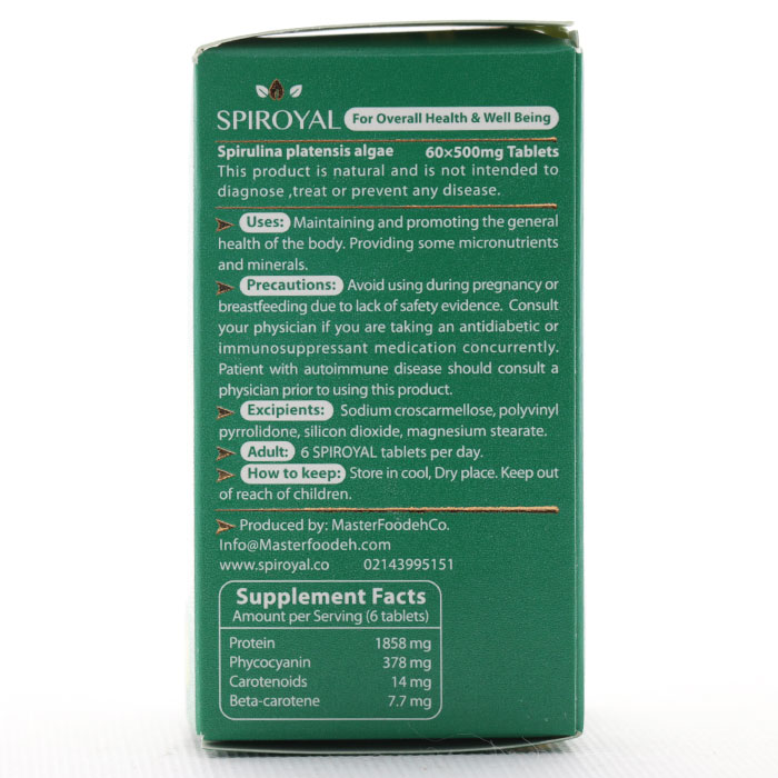قرص اسپیرویال نوعی فرآورده طبیعی حاوی 500 میلی گرم جلبک اسپیرولینا پلاتنسیس است. اسپیرولینا یک جلبک سبز-آبی است. این جلبک با بیش از 55% پروتئین، 18 آمینو اسید، مواد معدنی و انواع ویتامین ها یکی از منابع غذایی کمیاب در طبیعت است. این محصول برخی ریز مغذی های مورد نیاز بدن را تامین کرده و به سلامت عمومی بدن و تقویت سیستم ایمنی بدن کمک می کند.جدول ترکیبات اسپیرویال