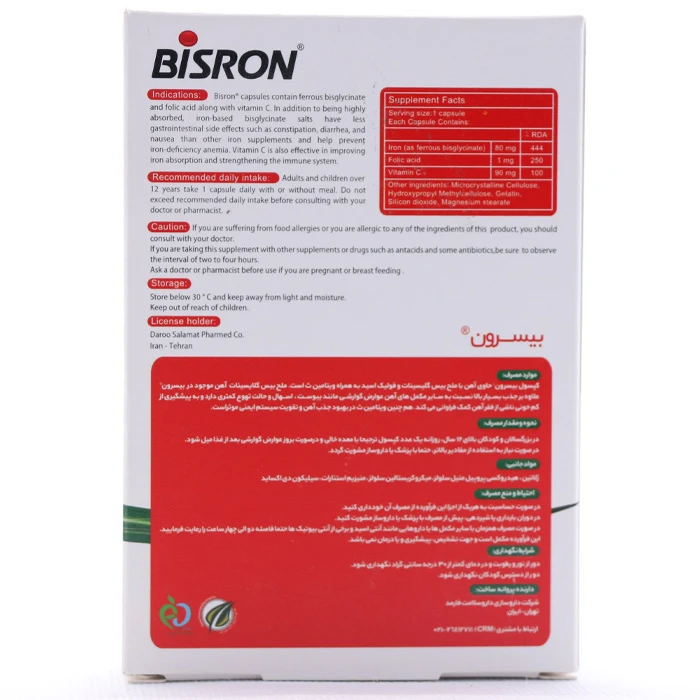کپسول بیسرون حاوی آهن با ملح بیس گلیسینات و فولیک اسید به همراه ویتامین ث است. ملح بیس گلیسینات آهن موجود در بیسرون علاوه بر جذب بسیار بالا نسبت به سایر مکملهای آهن عوارض گوارشی مانند یبوست، اسهال و حالت تهوع کمتری دارد و به پیشگیری از کم خونی ناشی از فقر آهن کمک فراوانی میکند. همچنین ویتامین ث در بهبود جذب آهن و تقویت سیستم ایمنی موثر است.