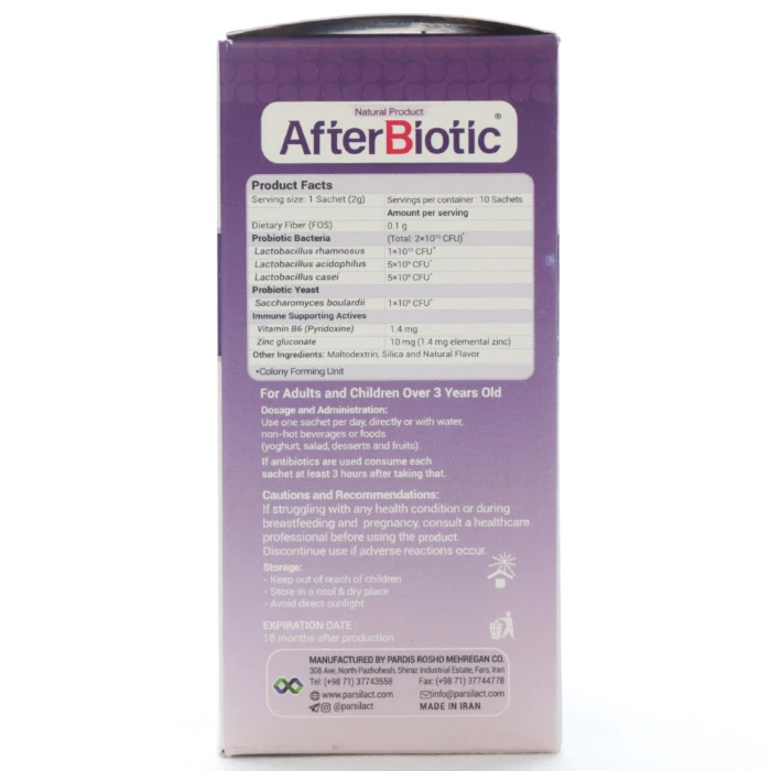 افتر بیوتیک پارسی لاکت ترکیبی قدرتمند از مخمر و باکتریهای پروبیوتیک مانند لاکتوباسیلوس رامنوسوس، اسیدوفیلوس، کازئی و ساکارومایسس بولاردی است که با فروکتوالیگوساکارید، زینک و ویتامین B6 غنی شده است. این مکمل به تقویت فلور طبیعی روده کمک میکند و نقش مؤثری در پیشگیری و درمان اسهال ناشی از مصرف آنتی بیوتیک یا اسهالهای حاد دارد.