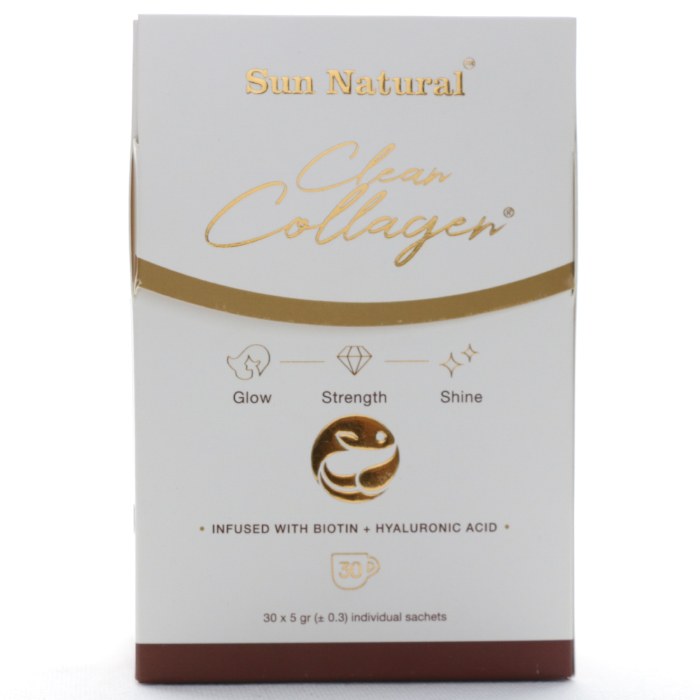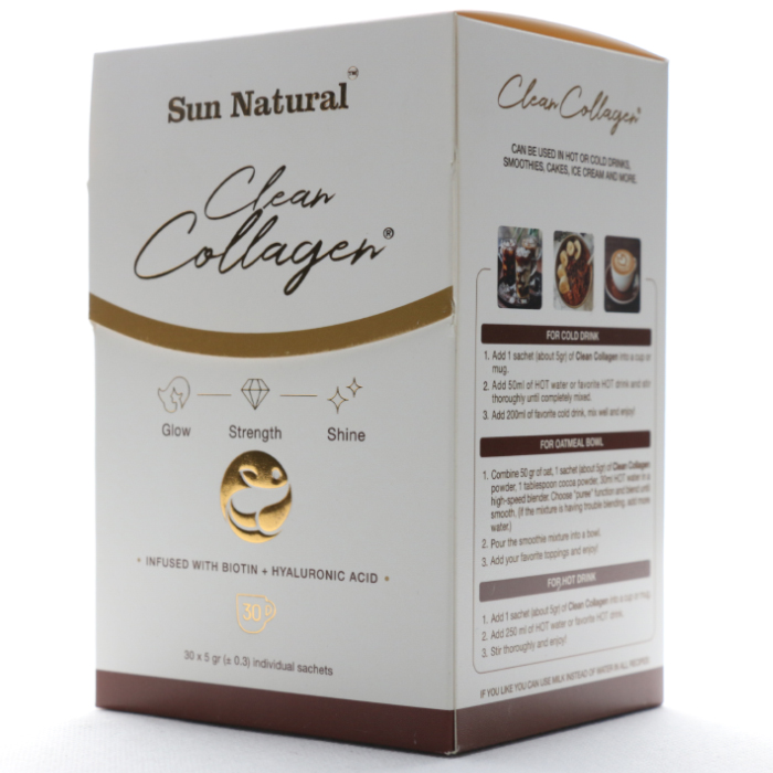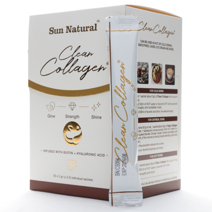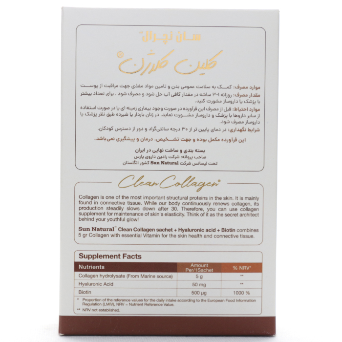 کلین کلاژن سان نچرال یک مکمل غذایی پیشرفته حاوی 5 گرم کلاژن هیدرولیز شده با منشا ماهی، 50 میلیگرم هیالورونیک اسید و 500 میکروگرم بیوتین در هر ساشه است. ساشه کلین کلاژن سان نچرال برای بهبود سلامت پوست، مو، ناخنها، مفاصل و استخوانها طراحی شده و بهدلیل جذب بالای کلاژن هیدرولیز شده، اثرات مناسبی در کاهش چینوچروک، افزایش رطوبت پوست و تقویت بافتهای همبند دارد. هیالورونیک اسید و بیوتین نیز به ترتیب به آبرسانی پوست و تقویت مو و ناخن کمک میکنند. کلین کلاژن بهصورت ساشه در جعبه مقوایی 30 عددی تحت لیسانس شرکت Sun Natural کشور انگلستان تولید میشود. شرکت رادین داروی پارس دارنده پروانه ساخت پودر کلین کلاژن در ایران است. Clean Collagen فاقد هرگونه افزودنی، شیرینکننده، طعمدهنده و مواد فرآوری شده بوده و در انواع نوشیدنیهای گرم، سرد، اسموتی، کیک و بستنی قابل استفاده است.کلین کلاژن سان نچرال برای چیست