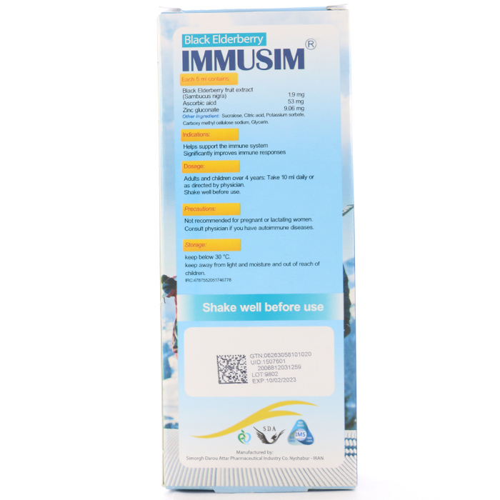 - شربت ایموسیم سیمرغ دارو، مکمل تغذیهای حاوی عصاره آقطی سیاه، ویتامین C و روی