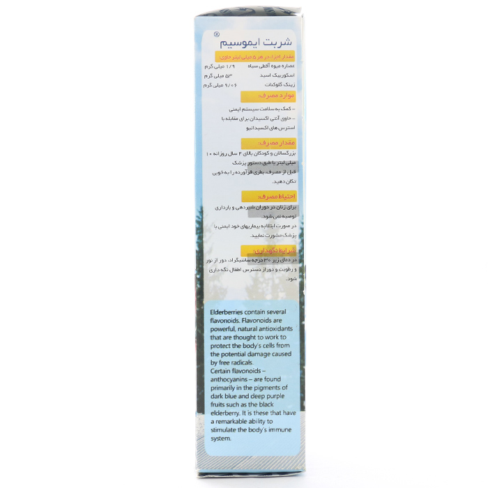 حاوی آنتی اکسیدان برای مقابله با استرسهای اکسیداتیو مناسب بزرگسالان و کودکان بالای ۴ سال کمک به سلامت سیستم ایمنیجدول ترکیبات شربت ایموسیم سیمرغ دارو