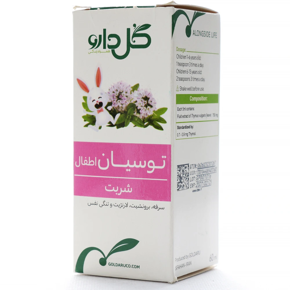شربت توسیان اطفال، یک محصول طبیعی و گیاهی است که از عصاره گیاه آویشن تهیه شده و برای کودکان بالای یک سال طراحی شده است. این شربت با ترکیبات فعال آویشن مانند تیمول و کارواکرول، به تسکین سرفه، برونشیت، لارنژیت و التهابات مجاری تنفسی کمک کرده و عملکرد دستگاه تنفسی را بهبود میبخشد. این فراورده به شکل شربت ۶۰ میلیلیتری توسط شرکت گل دارو در ایران تولید میشود.