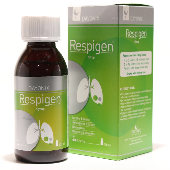 شربت رسپیژن، تحت برند شرکت دایونیکس فارما آلمان، یک محصول حاوی عصارههای گیاهی، ویتامینها و مواد معدنی است که بهبود سرفه و عملکرد ریه را تسهیل میکند. این محصول شامل ترکیباتی مانند عصاره گون، بروملاین و پیچک است که از گذشته در بهبود بیماریهایی از قبیل سرماخوردگی، سرفه و گلودرد مورد استفاده قرار گرفته است. رسپیژن تحت لیسانس شرکت دایونیکس فارما آلمان تولید میشود.