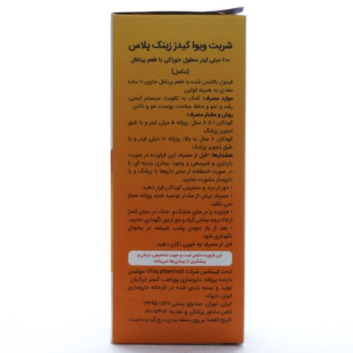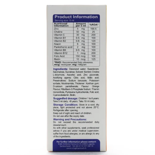 این شربت با طعم پرتقالی دلپذیر، مصرف آن را برای کودکان بالای ۱ سال و بزرگسالان آسان میسازد و تولید شده توسط ویتافارمد سوئیس است.