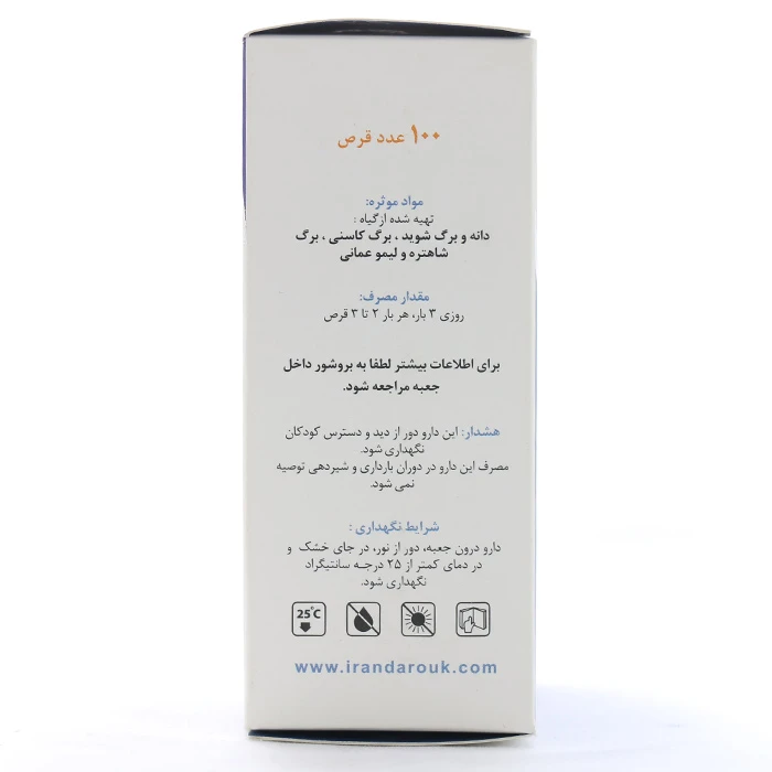 – این قرص شامل دانه و برگ شوید، عصارههای حاصل از ریشه و گل کاسنی، برگ شاهتره و لیمو عمانی است.