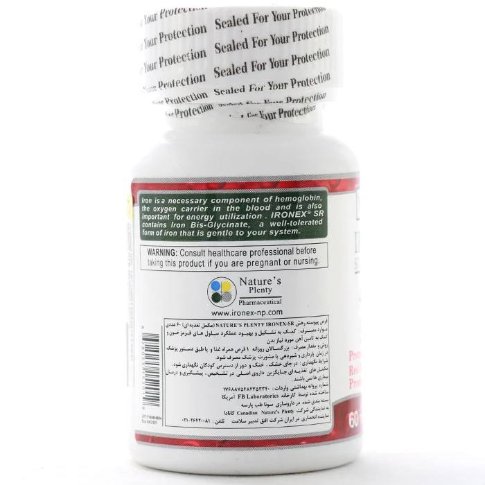 قرص آیرونکس اس آر نیچرز پلنتی، دارای ترکیبات آهن، ویتامین B ۱۲، ویتامین C، ویتامین B ۶ و زینک میباشد.