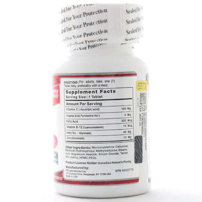 • حاوی فولیک اسید، ویتامین B۱۲، ویتامین C، ویتامین B۶ و زینک