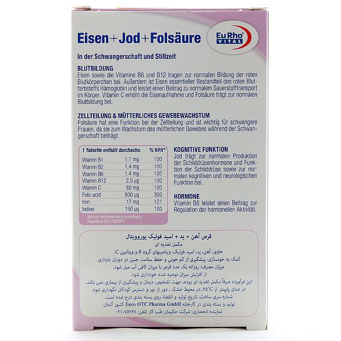 حاوی آهن، ید، فولیک اسید (B۹)، ویتامین‌های C ،B۱ ،B۲ ،B۶ ،B۱۲ تامین آهن، ید و فولیک اسید در دوران بارداری و شیردهی پیشگیری از بروز آسیب‌های مغزی- نخاعی در جنین کمک به رشد و تکامل سیستم عصبی جنین ضروری در دوران بارداری و پیش از بارداری پیشگیری از تولد نوزاد با وزن کم   برای مشاهده بیشتر مکمل های دوران بارداری اینجا کلیک نمایید.   خرید قرص آیزن و ید و فولیک اسید یوروویتال 60 عددی