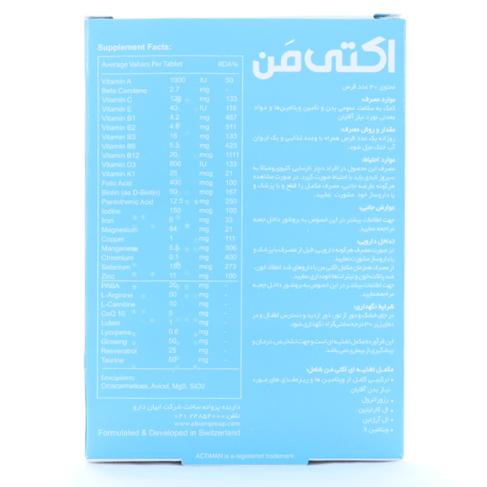 - قرص اکتی من ابیان دارو مکمل تغذیه ای است و جهت تشخیص، درمان و پیشگیری از بیماری نیست.