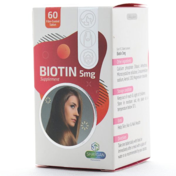 بیوتین 5 میلیگرم شایگان با تامین دوز مطلوبی از ویتامین ب7، در تقویت مو، پوست و ناخن،و کمک در تنظیم متابولیسم پروتئین، کربوهیدرات و چربی، جلوگیری از ریزش مو، افزایش استحکام ناخنها و کاهش خشکی و التهاب پوست کمک میکند. این ویتامین با بهبود سنتز کراتین و اسیدهای چرب، رشد و سلامت این اجزا را تقویت کرده و در متابولیسم انرژی و کاهش علائم نوروپاتی دیابتی نیز مؤثر است.
