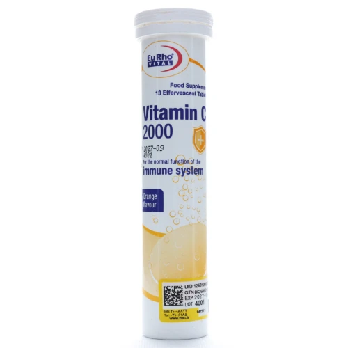 برای افزایش پذیرش و بهبود طعم، این مکمل با طعم پرتقال تولید شده است. قرص جوشان ویتامین C 2000 یوروویتال در قوطیهای ۱۳ عددی، تحت لیسانس Euro OTC Pharma GmbH آلمان و توسط شرکت حکیمان طب کار در ایران ساخته میشود.