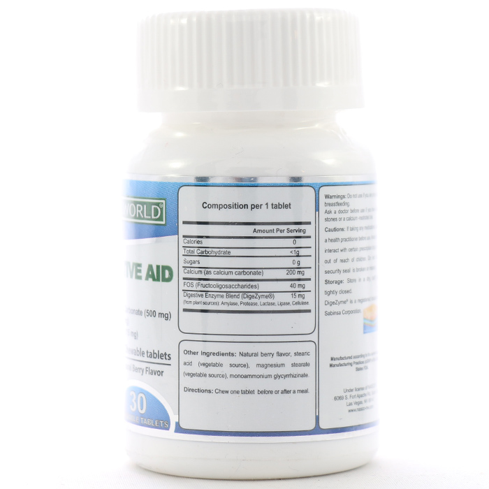 قرص دایجستیو اید نچرال ورلد یک ترکیب از آنزیمهای مورد نیاز برای هضم غذا (بدون منشأ حیوانی) همراه با کربنات کلسیم (مهارکننده اسید معده) و فروکتواولیگوساکاریدها (F.O.S) که جذب کلسیم را افزایش میدهند، میباشد. طبق تحقیقات و مقالات اخیر، مصرف قرص قابل جویدن حاوی کربنات کلسیم میتواند با سرعت و قدرت بیشتری به کاهش علائم این بیماری کمک کند.برای تهیهي قرص دایجستیو اید نچرال ورلد به داروخانه آنلاین دارونت مراجعه فرمایید.ویژگیهای قرص دایجستیو اید نچرال ورلد