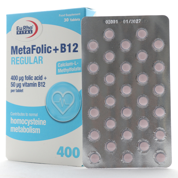 قرص متافولیک پلاس B12 رگولار یوروویتال با ترکیبی از 400 میکروگرم فولیک اسید به فرم کلسیم ال-متیل فولات و 50 میکروگرم ویتامین B12 تولید شده است. کلسیم ال-متیل فولات به عنوان فرم فعال فولیک اسید، با جذب و زیست فراهمی بالا به بهبود خون سازی، تنظیم سطح هموسیستئین و حفظ سلامت سیستم عصبی کمک میکند. این مکمل با افزایش سطح انرژی و کاهش خستگی، گزینهای ایده آل برای پیشگیری از کم خونی و حمایت از سلامت عمومی بدن محسوب میشود.متافولیک پلاس ب12 رگولار برای چیست