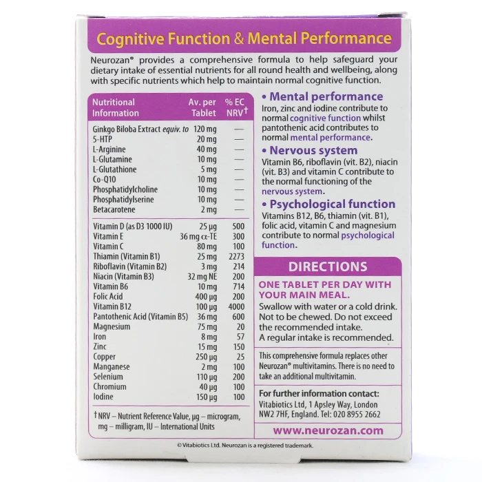 قرص نروزان ویتابیوتیکس حاوی ریزمغذیها، ویتامینها و مواد معدنی مورد نیاز بدن، میتواند به حفظ و سلامت سیستم عصبی و مغز، حفظ حافظه، ارتقا هوشیاری، پیشگیری از افسردگی و پیشگیری از زوال مغز کمک کند. بنابراین، قرص نروزان ویتابیوتیکس میتواند بهبود سیستم عصبی و حافظه را تقویت کند.
