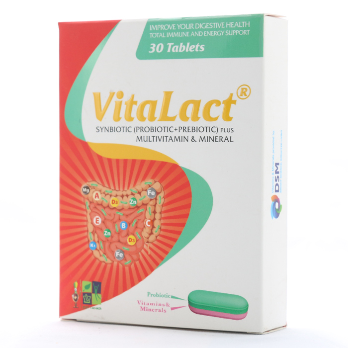 - قرص ویتالاکت زیست تخمیر حاوی مقادیر بالایی از ۳ گونه پروبیوتیک مفید، انواع ویتامینها و املاح ضروری برای بدن میباشد.