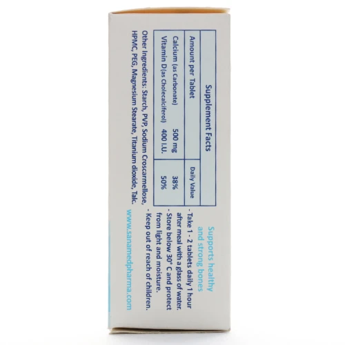 هر قرص تقریباً 500 میلیگرم کلسیم (به صورت کلسیم کربنات) و حدود 400 واحد بینالمللی (IU) ویتامین D3 دارد.