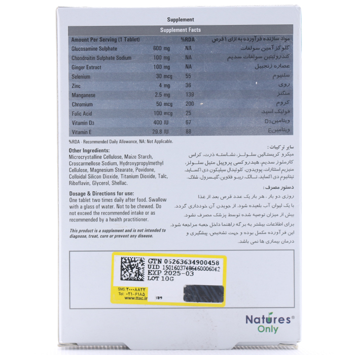 1. گلوکوزامین سولفات: گلوکوزامین سولفات یک ترکیب طبیعی است که در غضروف مفاصل یافت میشود. این ماده بهبود عملکرد مفاصل را تسهیل میکند، باعث بهبود و افزایش تولید غضروف جدید میشود و به حفظ و تقویت ساختار غضروف کمک میکند.