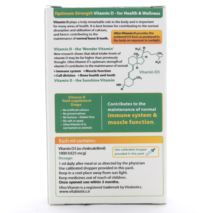 قطره اولترا د3 1000 ویتابیوتیکس منجر به تقویت و استحکام استخوان در کودکان میگردد. این مکمل ویتامین D، جذب بهتر کلسیم را در بدن تسهیل کرده و به بهبود سیستم ایمنی کودکان کمک میکند. قطره اولترا د3 1000 ویتابیوتیکس بدون حاوی مواد نگهدارنده و رنگهای مصنوعی عرضه میشود.برای تهیهي قطره اولترا د3 1000 ویتابیوتیکس به داروخانه آنلاین دارونت مراجعه فرمایید.ویژگی های قطره اولترا د3 1000 ویتابیوتیکس