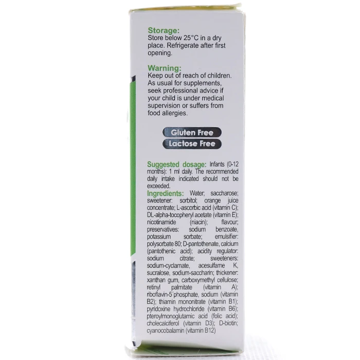 حاوی ۱۵۰۰ واحد بین المللی ویتامین A و ۴۰۰ واحد بین المللی ویتامین D معادل نیاز روزانه نوزادان ۱-۰ سال