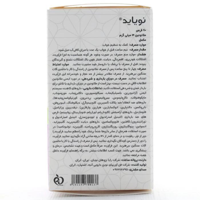 - قبل از شروع درمان با داروی ملاتونین (Melatonin) بروشور دارویی داخل بسته را به دقت مطالعه کنید. این بروشور به شما کمک میکند تا اطلاعات جامعی را راجع به قرص ملاتونین نویایدبه دست آورده و از عوارض جانبی احتمالی آن مطلع شوید. همچنین اگر در رابطه با مصرف آن با سؤالاتی روبرو هستید با پزشک خود مشورت نمایید.