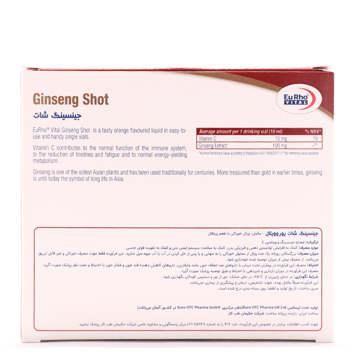 ویال جینسینگ شات یوروویتال با ترکیباتی از عصاره جینسینگ و ویتامین C تهیه شده است. این محصول به منظور افزایش توانمندیهای ذهنی و بدنی، تقویت عملکرد جنسی، و حفظ سلامتی سیستم ایمنی ترویج میشود.