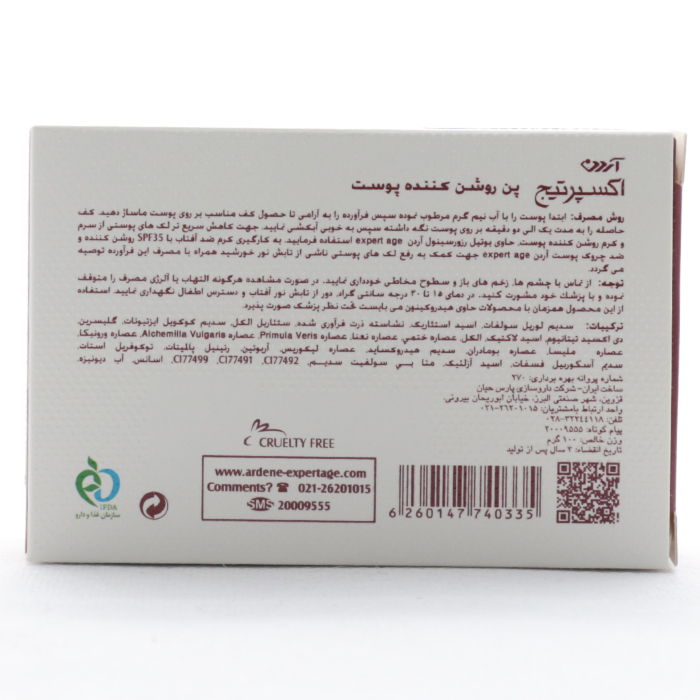 پن روشن کننده آردن اکسپرتیج برای افراد بالای 40 سال با انواع پوست فرموله شده و جهت استفاده روزانه بر روی پوست صورت و بدن گزینه مناسبی به شمار میرود. این محصول فرمولاسیونی بر پایه کمپلکس روشنکننده و ضدلک، فاقد مواد صابونی، هیدروکینون و کوجیکاسید داشته و مانع بروز حساسیت و تحریکات پوستی میشود. برای مشاهده وخرید سایر محصولات برند آردن لطف وارد این صفحه شوید.ویژگی های پن روشن کننده آردن اکسپرتیج