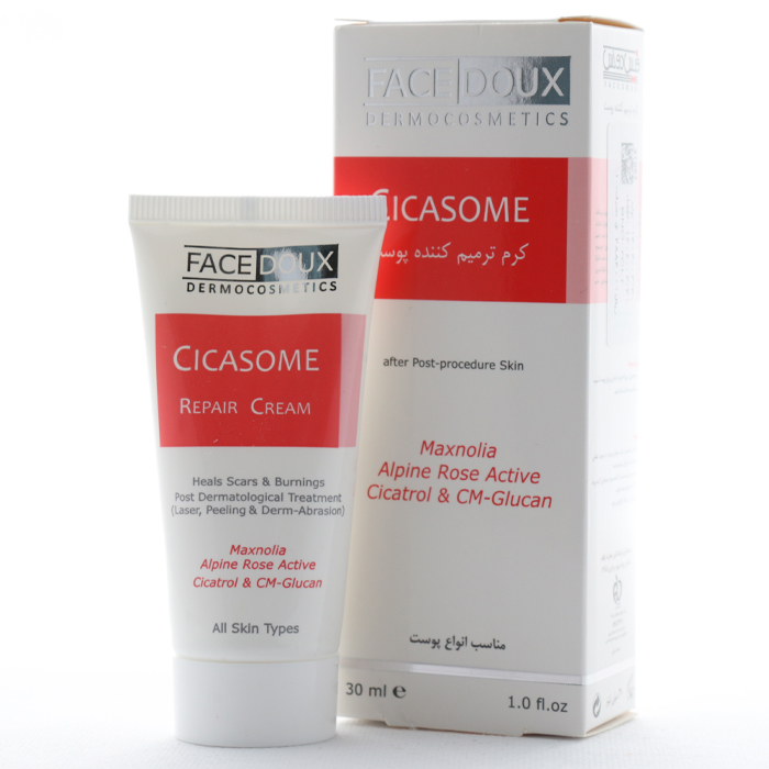 کرم ترمیم کننده پوست سیکازوم با فرمولاسیون منحصربهفرد خود به بافت عمیق پوست نفوذ کرده ومیتواند جای زخم و لک را روشن کند. ترمیم کننده فیس دوکس با PH متناسب با پوست تولید شده و ترمیم و بازسازی قسمت آسیب