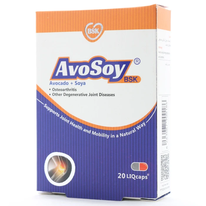 کپسول آوسوی یک مکمل گیاهی است که حاوی سویا و آووکادو میباشد. این کپسول با تأثیر بر بافت همبند، از طریق تحریک تولید پروتئوگلیکانها و کلاژن، باعث بازگرداندن ساختمان غضروف به حالت طبیعی میشود. از طرف دیگر، با مهار تولید واسطههای التهابی مانند پروستا گلاندین E۲ و کاهش التهاب در مفاصل، قرص آوسوی بی اس کی باعث کاهش درد و بهبود از کار افتادگی میشود.