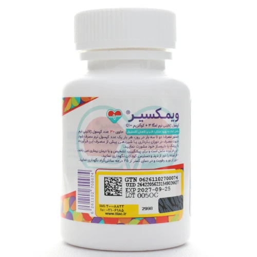 کپسول امگا3 و کیوتن ویمکسیر،یک مکمل غذایی حاوی ۱۰۰۰ میلیگرم روغن ماهی (با ۴۵۰ میلیگرم EPA و ۱۸۰ میلیگرم DHA) و ۳۰ میلیگرم کوآنزیم Q10 در هر سافتژل است. این ترکیب به تأمین اسیدهای چرب ضروری بدن و حمایت از سلامت قلب کمک میکند. محصول به صورت سافتژل و در قوطی پلاستیکی ۳۰ عددی توسط شرکت نیک سینا اکسیر تولید میشود.