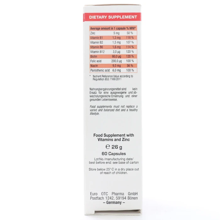 روغن دانه سویا، ژلاتین گاوی، روغن نارگیل سفت شده، زینک گلوکونات، گلیسیرین تثبیت کننده، لسیتین، نیکوتینامید، سوربیت تثبیت کننده، کلسیم- دی- پانتوتنات، رنگ دهنده تیتان دی اکساید، رنگ دهنده اکسید آهن و هیدروکسید آهن، ویتامین B۶، ویتامین B۲، ویتامین B۱، فولیک اسید (B۹)، بیوتن (B۷)، ویتامین B۱۲
