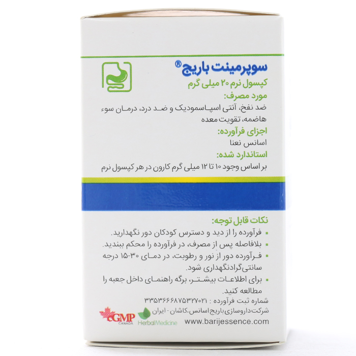 کپسول سوپرمینت باریج حاوی اسانس نعنا و مواد مؤثرهای مانند کارون و متیل استات است. این کپسول به عنوان یک ضد نفخ، آنتیاسپاسمودیک و ضد درد به کار میرود و برای درمان سوء هاضمه و تقویت معده نیز مؤثر است.