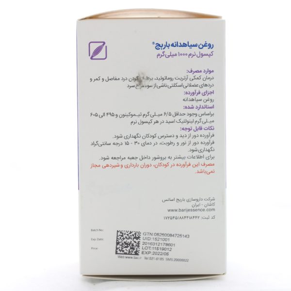 کپسول سیاه دانه حاوی ۱۰۰۰ میلی گرم روغن سیاه دانه می باشد. قرص سیاه دانه باریج اسانسه جدید از شرکت باریج میباشد. کپسول سیاه دانه باریج اسانس با دارا بودن روغن سیاه دانه، به درمان آرتریت روماتوئید و درمان دردهای مفاصل و کمر مؤثر است.