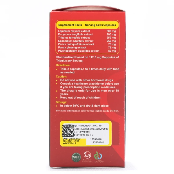 حاوی عصاره خشک گیاه ماکا، مویرا پوآما، اپیمدیوم، خارخاسک، جینسینگ آمریکایی، پاناکس جینسینگ و تونکات علی بوده و بر اساس ۲۵/۵۶ میلیگرم ساپونین موجود در گیاه خارخاسک استاندارد شده است.