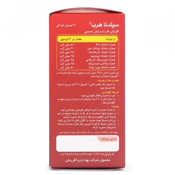 کپسول سیلدنا هرب بهتا دارو یک مکمل غذایی است که ادعا میشود تقویت میل جنسی، افزایش توان جنسی در مردان و افزایش قدرت باروری را تقویت میکند. این مکمل حاوی مخلوطی از عصاره خشک گیاهان، از جمله ماکا، تونکات علی، اپیمدیوم، خارخاسک، جینسینگ آمریکایی، پاناکس جینسینک و مویرا پوآما است.