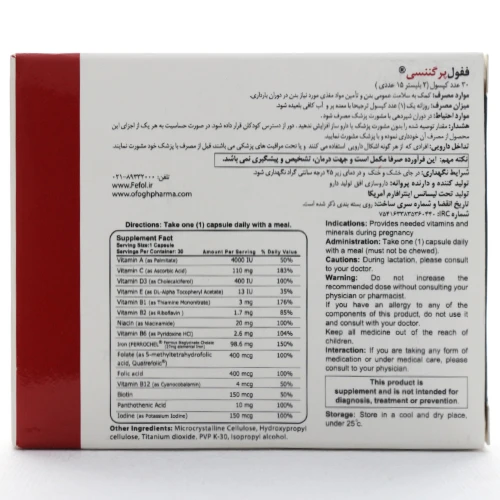 کپسول ففول پرگننسی یک مکمل پیشرفته برای دوران بارداری است که نیازهای تغذیهای مادر و جنین را به طور کامل تأمین میکند. ففول پرگننسی حاوی مجموعهای جامع از ویتامینها و دو ماده معدنی حیاتی، آهن و ید است.