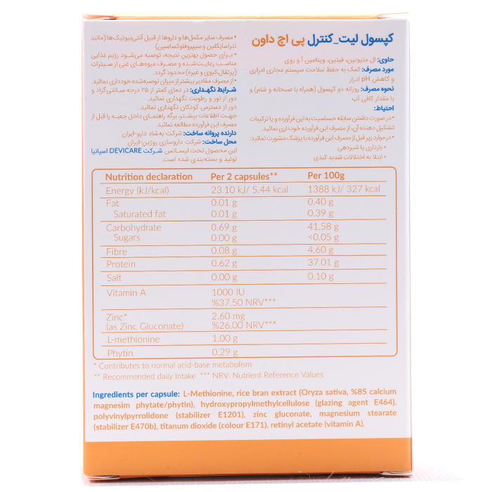 پاسخ: کپسول لیت کنترل پی اچ داون بهشاد دارو شامل ال متیونین، فیتین، ویتامین آ و روی است.