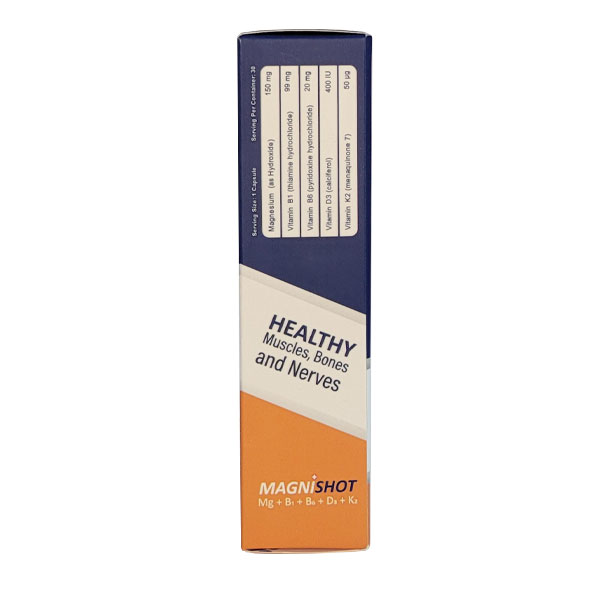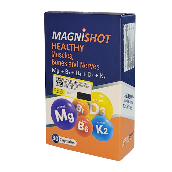 کپسول مگنی شات یک مکمل تغذیهای با محتوایی متنوع از ویتامینها و مواد معدنی مانند منیزیم، ویتامین B1، ویتامین B6، ویتامین D3، و ویتامین K، که نقش مهمی در حفظ و افزایش سلامت سیستم عصبی و عضلانی دارند.