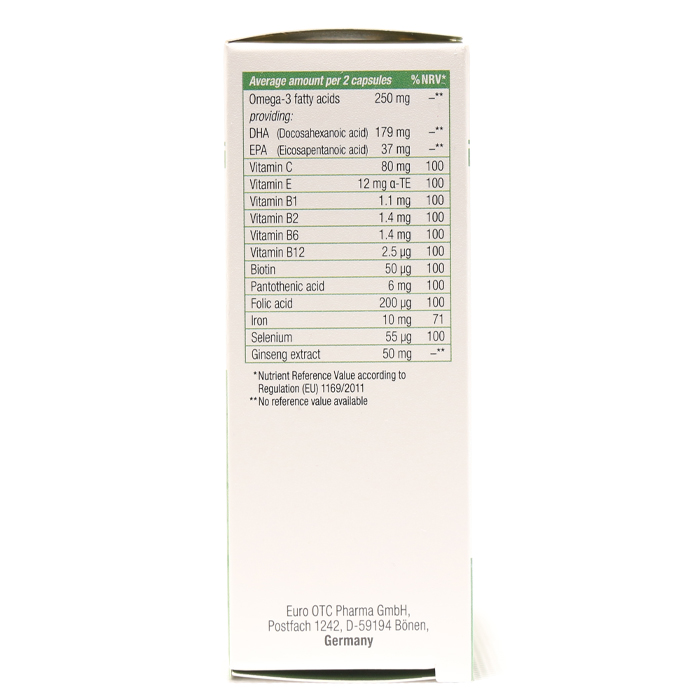 – این کپسول حاوی عصاره ژینسنگ، امگا-۳، ویتامین C، ویتامین E، ویتامین‌های گروه B، آهن و سلنیوم است.