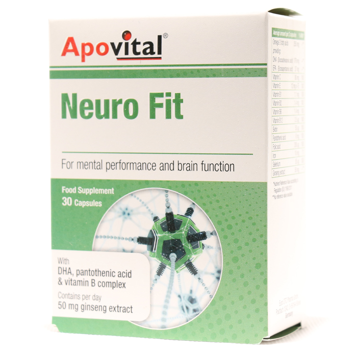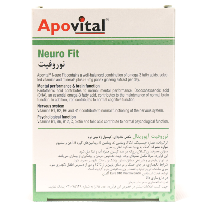 کپسول نوروفیت آپوویتال حاوی عصاره ژینسنگ، امگا-۳، ویتامین C، ویتامین E، ویتامین‌های گروه B، آهن و سلنیوم است.کپسول نوروفیت آپوویتال باعث بهبود عملکرد ذهنی و توانایی‌های مغزی می‌شود و همچنین دارای خاصیت ضد التهابی و آنتی اکسیدانی می‌باشد. ترکیبات مؤثر کپسول نوروفیت آپوویتال به احساس آرامش و پیشگیری از کم‌خونی کمک می‌کند. این مکمل تحت لیسانس کشور آلمان به عنوان یکی از بهترین مکمل‌های تقویت حافظه و یادگیری شناخته می‌شود.برای تهیه‌ي کپسول نوروفیت آپوویتال  به داروخانه آنلاین دارونت مراجعه فرمایید.