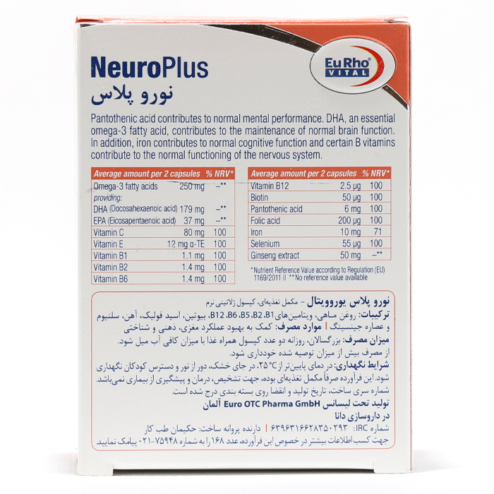 -کپسول نورو پلاس یوروویتال حاوی عصاره جینسینگ، امگا ۳، ویتامینها و مواد معدنی لازم برای حفظ سلامت سیستم عصبی است. روغن ماهی، ویتامینهای گروه B و عصاره جینسینگ از جمله مؤثرات اصلی آن میباشند.