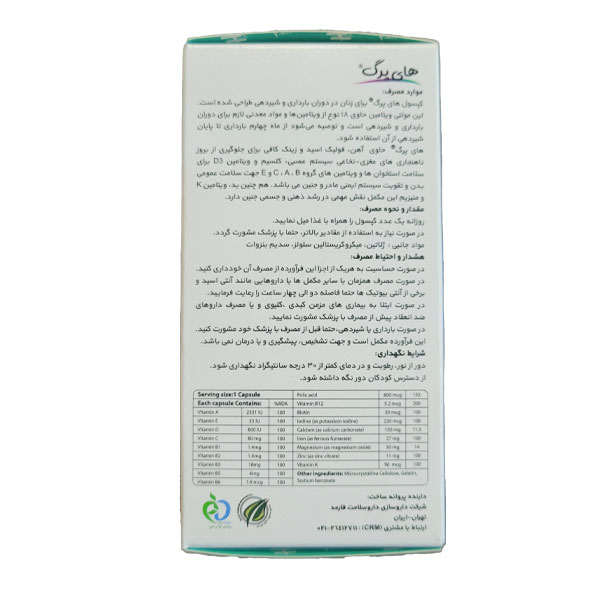 • حاوی ۱۸ نوع ویتامین و ماده معدنی مورد نیاز دوران بارداری