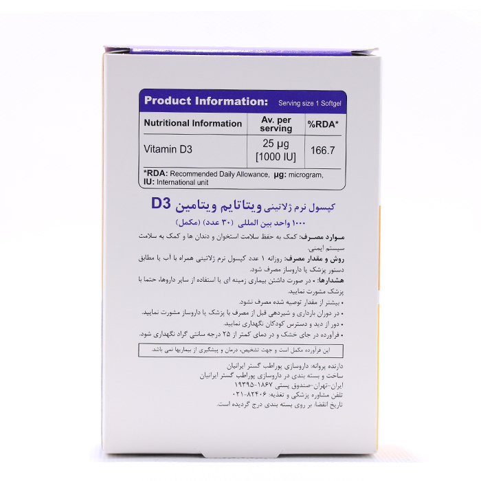 ویتامین D۳ | ۲۵µg(۱۰۰۰IU) | ۱۶۶,۷% |