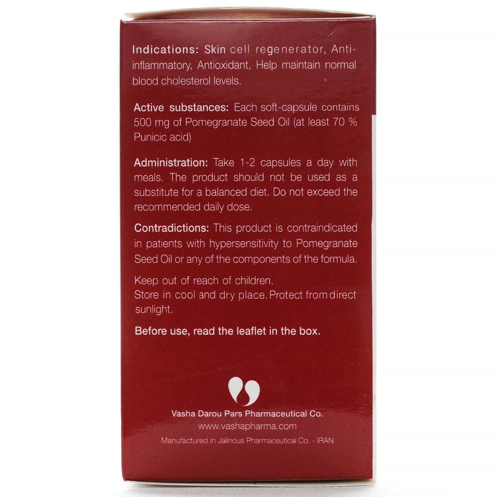 روغن دانه انار که در کپسولهای پومگا 5 حاوی 500 میلیگرم روغن دانه انار است، دارای خصوصیات فوقالعادهای است. این روغن با ویتامینها و مواد معدنی متعددی مثل ویتامین C و A، آنتیاکسیدانها و پونیسیک اسید که یک نوع اسید چرب امگا 5 است، به بهبود سلامت قلب، پوست و کمک به کاهش خطر بیماریهای مزمن کمک میکند.