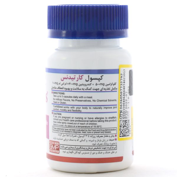 کارتیدنس یک مکمل غذایی با کیفیت بالا است که برای حفظ سلامت مفاصل، افزایش الاستیسیته و کاهش درد مفاصل طراحی شده است. هر کپسول از این محصول حاوی ۵۰۰ میلیگرم گلوکزآمین، ۴۰۰ میلیگرم کندرویتین سولفات و ۱۰۰ میلیگرم متیل سولفونیل متان است. این ترکیبات به بهبود عملکرد مفاصل و کاهش ناراحتیهای مرتبط با آن کمک میکنند.زمان مصرف کپسول کارتیدنس