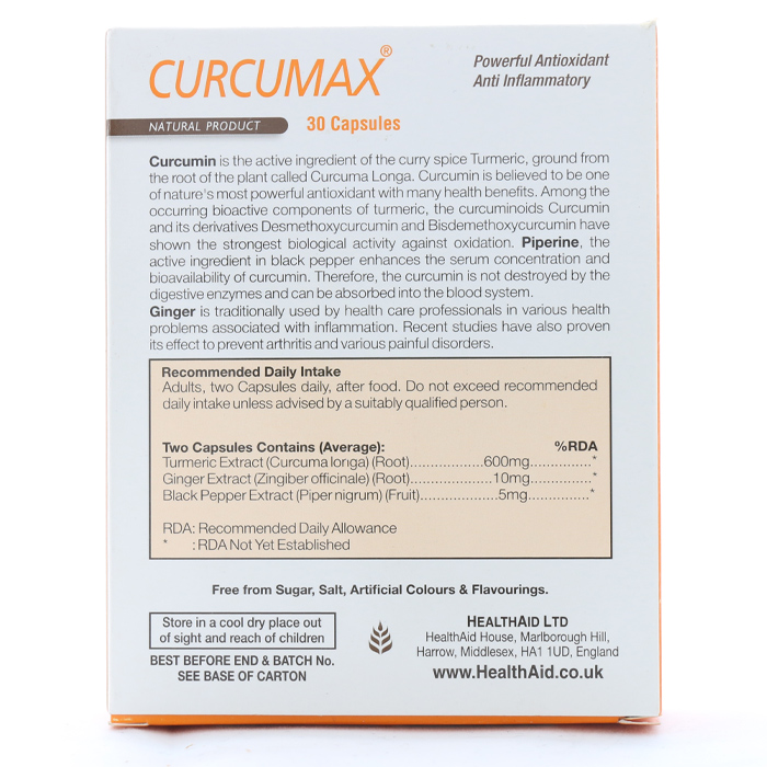 کپسول کورکومکس هلث اید حاوی عصاره زنجبیل، فلفل سیاه و زردچوبه است.
