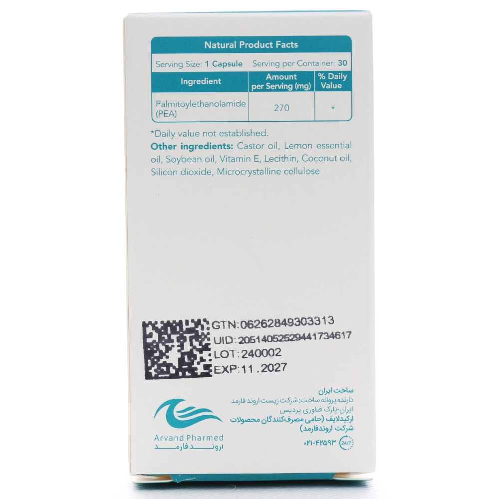 کپسول پیلایت اروند فارمد، فرآورده طبیعی که برای کمک به کاهش درد و التهاب در سنین بالای 18 سال کاربرد دارد. پیلایت حاوی 270 میلی گرم پالمیتوئیل اتانول آمید (PEA) در هر کپسول است و علاوه بر تسکین درد و التهاب، به حفاظت از سلول های عصبی و بهبود خلق و خو و خواب نیز کمک می کند.
